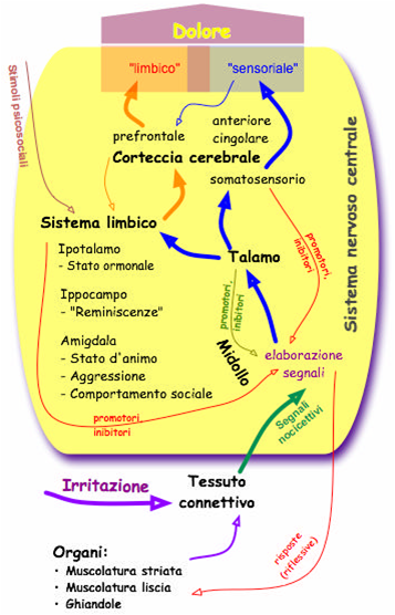 Torniamo al discorso di prima. Dallo stimolo doloroso, passando per la periferia e afferenze nervose, si arriva al midollo fino alle strutture centrali che incidono sulle componenti empiriche. In questo modo, anche l'esperienza del dolore, il ricordo del dolore, può dare un grande significato alla sintomatologia dolorosa, nonché affettiva, che ne modula in maniera molto importante la percezione.